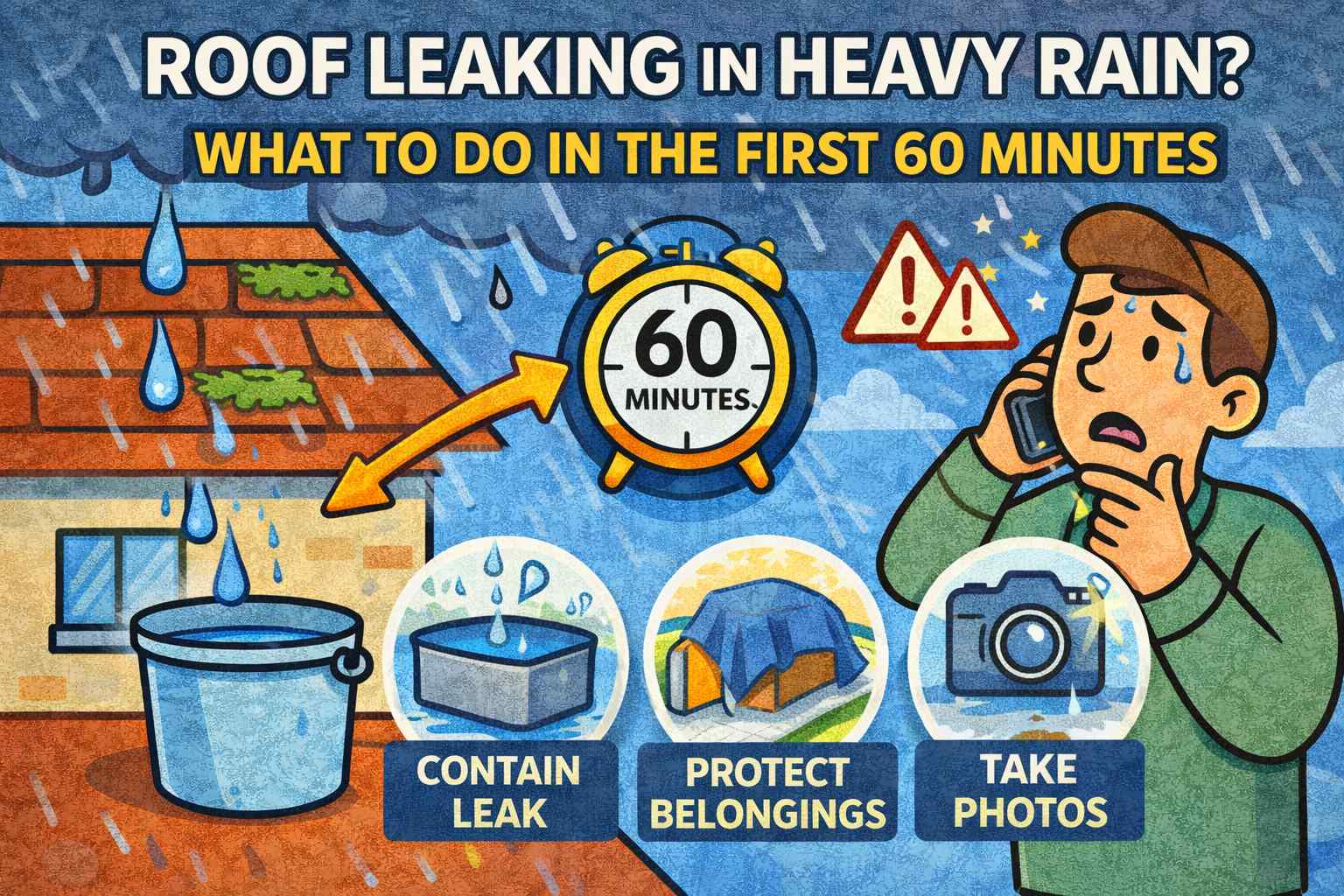 Roof Leaking in Heavy Rain? What to Do in the First 60 Minutes